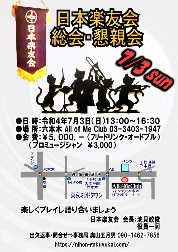●日 時:令和4年(2022年)7月3日(日)13:00〜16:30 ●場 所:六本木 All of Me Club 03-3403-1947 地下鉄 日比谷線・大江戸線 六本木下車 千代田線 乃木坂下車 ●会 費:¥5,000.− (フリードリンク・オードブル) (プロミュージシャン ¥3,000) 個々に別途有料にて他の食べ物のオーダーにも応じていだけます。 ●持込み:飲み物などご持参いただくこと歓迎です。 ●お願い:器楽演奏をしていただける方は楽器等をご持参ください。 ヴォーカルの方は譜面のご用意をよろしくお願いします。 出欠返信は6月15日までに奥山にお願いします。 ●出欠連絡・問い合わせ: 事務局長 奥山五月男 ⇒ 案内状 印刷用 (2022/4/23) (2022/6/7 改訂)
